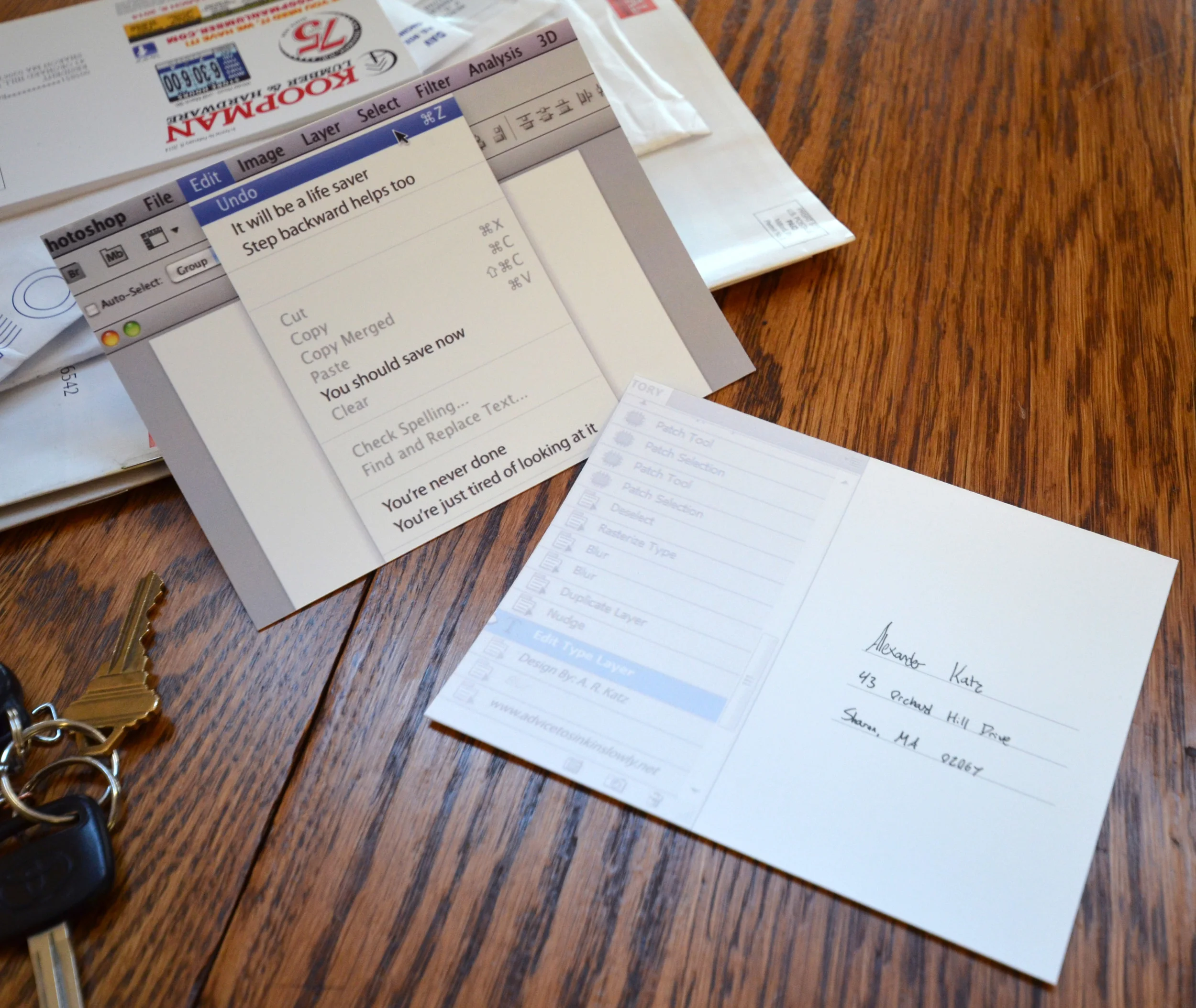 This postcard was created as a submission to the Advice to Sink in Slowly movement as a few pieces of advice from an upper level graphic designer to a first year.